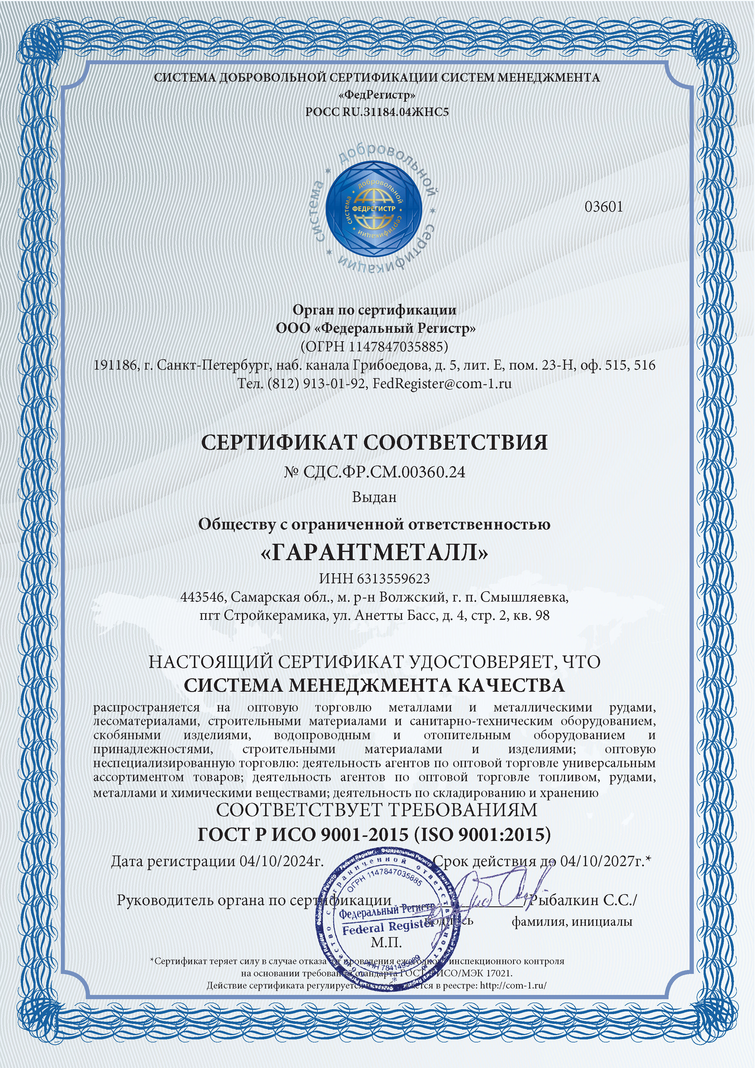 Компания ООО "ГАРАНТМЕТАЛЛ" прошла проверку системы менеджмента качества и соответствет требования ГОСТ Р ИСО 9001-2015 (ISO 9001:2015)